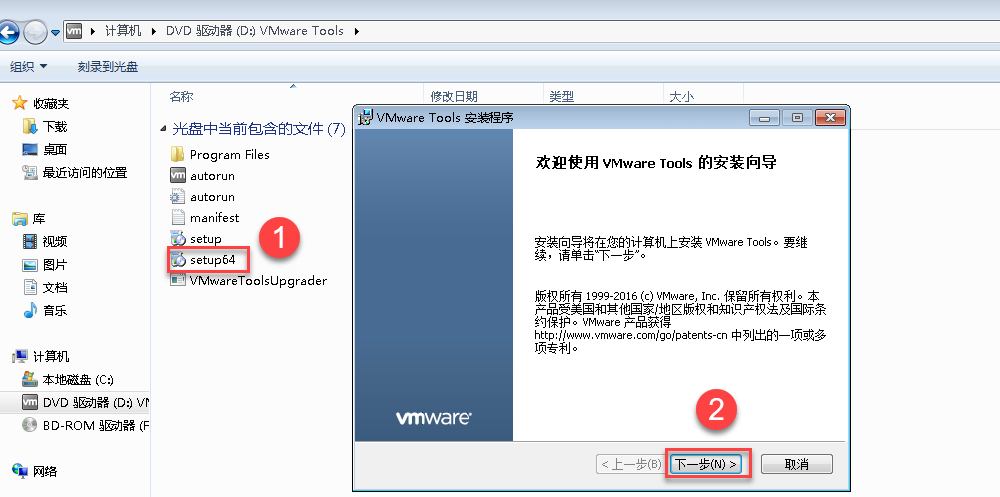 3.打开Windows操作系统控制台,单击“计算机-->VMware Tools”,连续单击“下一步”即可完成安装。