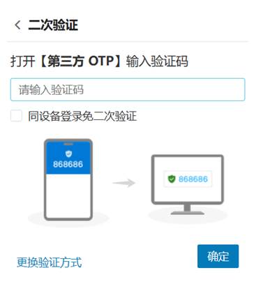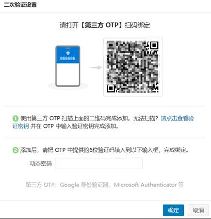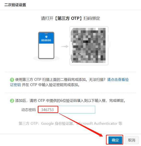 ① 使用第三方OTP扫码绑定可参考:绑定流程,并填入正确的验证码,如图:“图3-1-5”