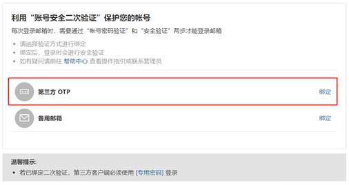 (1) 选择第三方 OTP 二次验证 “绑定”,如“图2-1-1”“图2-1-2”