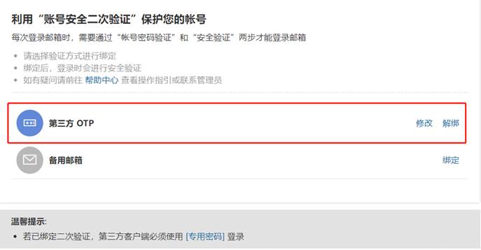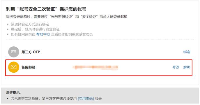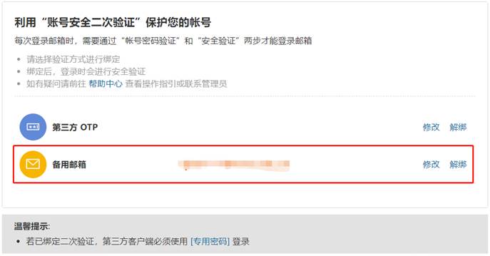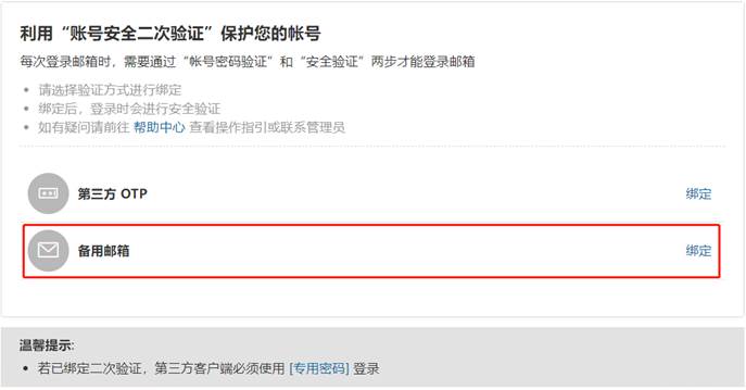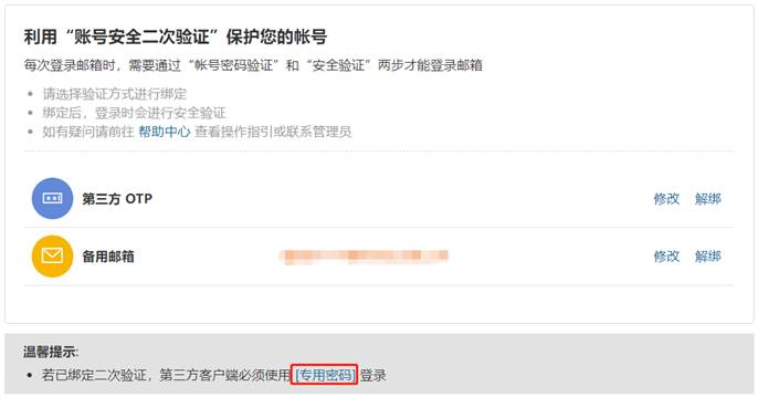 设置二次验证后,客户端(除浏览器网页外的所有方式,包括其它邮箱代收)必须用专用密码访问,建议先设置好客户端专用密码,再开启二次验证,并设置两种验证方式
