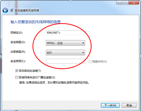 2、输入网络名:XMUNET+,选择图示的安全类型和加密类型