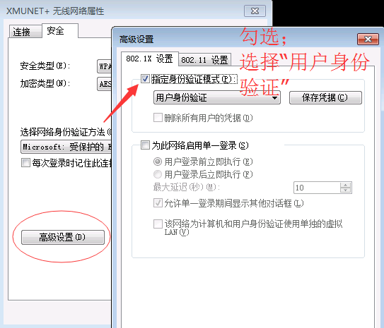 在XMUNET+的安全属性里,进行高级设置,设置指定用户身份验证。