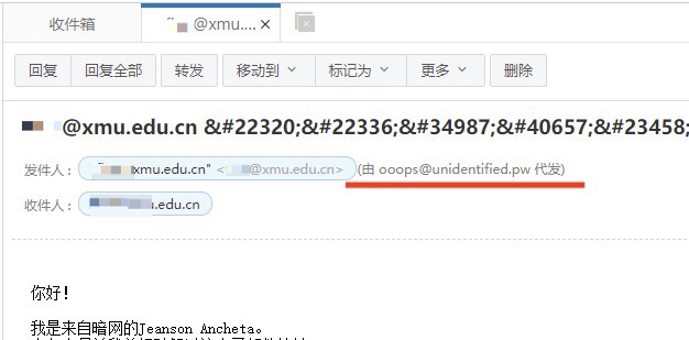 有些攻击者会使用代发邮件的方式来发送邮件,所以在收到下图这种代发邮件时,请务必确认发送人的身份后再点击邮件内的链接。
