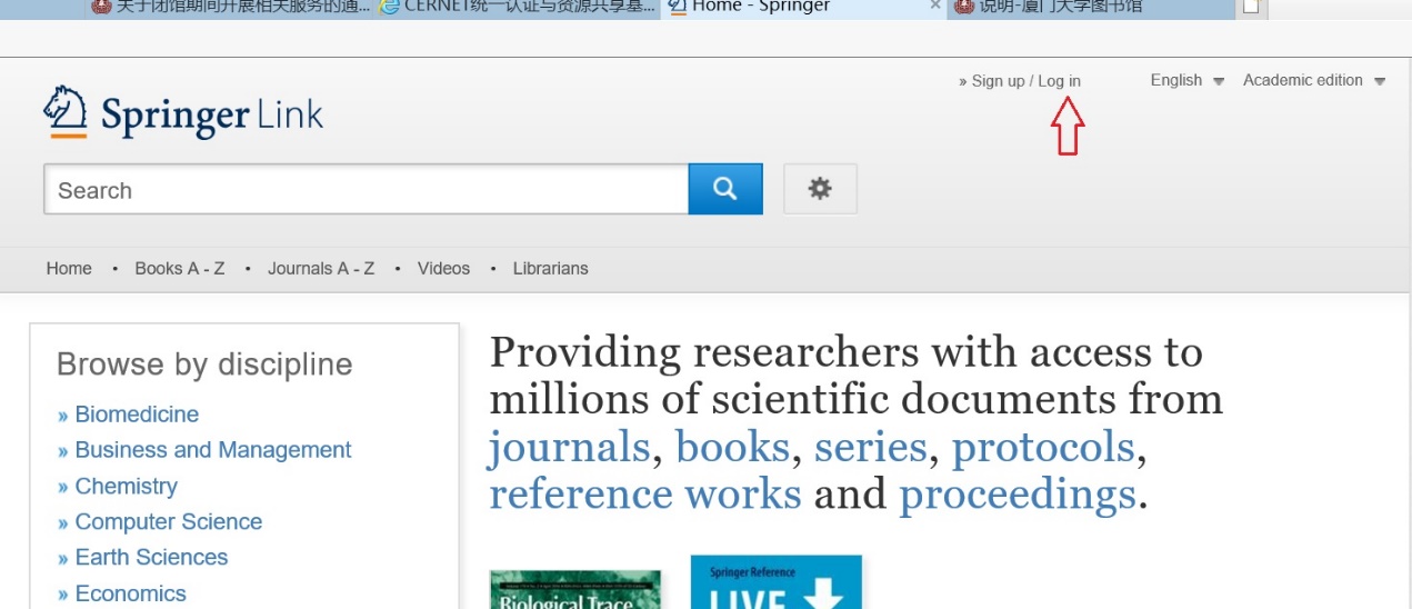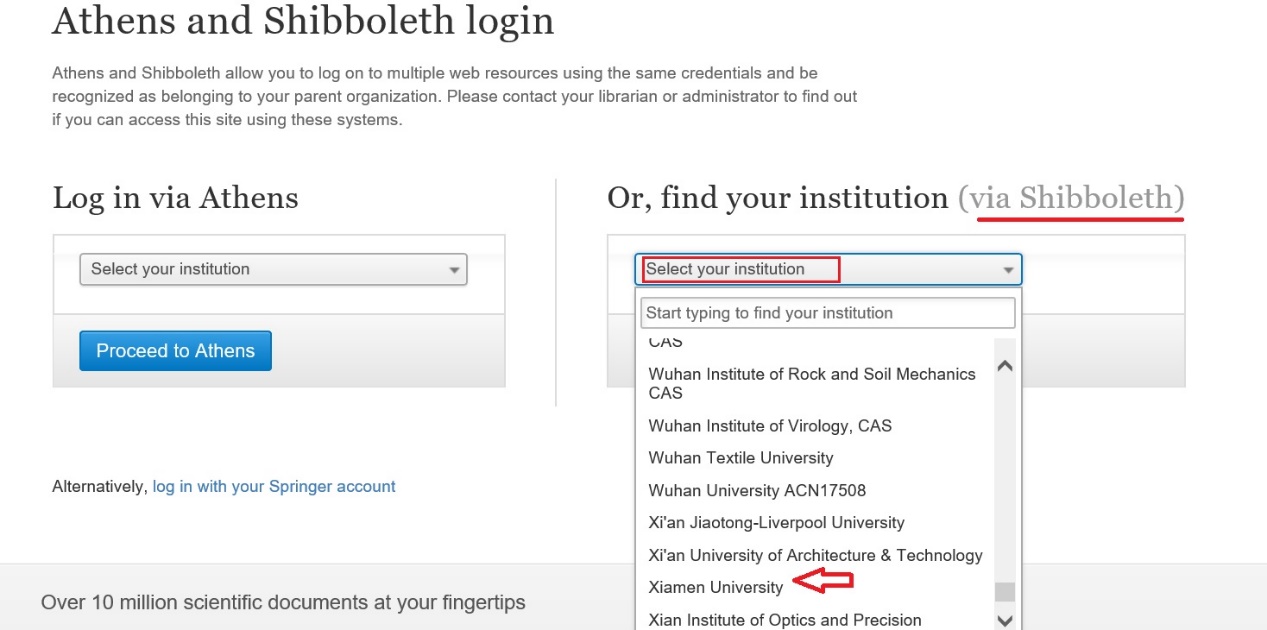 登入各数据库时,还需在各库网站首页选择厦门大学(Xiamen University)使用本校的统一身份账号认证,请注意找到sign in或find my institution入口。下面是以Springer数据库为例: