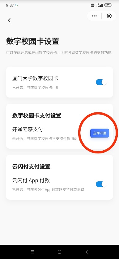 4. 使用“厦大数字校园卡”在校内食堂消费时,资金直接由“云闪付”绑定的银行卡中支出,无需圈存或转账。用户应确保绑定的银行卡有足额的资金用于支付,由于余额不足导致交易失败或欠费,将影响“厦大数字校园卡”和“云闪付”的使用,长期欠费还会影响用户的金融信誉。