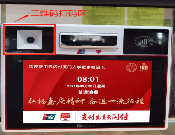 “厦大数字校园卡”可在校内食堂消费。用户将亮屏状态的“厦大数字校园卡”二维码(如图4)或“云闪付”付款码(如图6),对准售卖窗口POS机的扫码区(如图7)进行支付,资金直接由“云闪付”绑定的银行卡中支出。