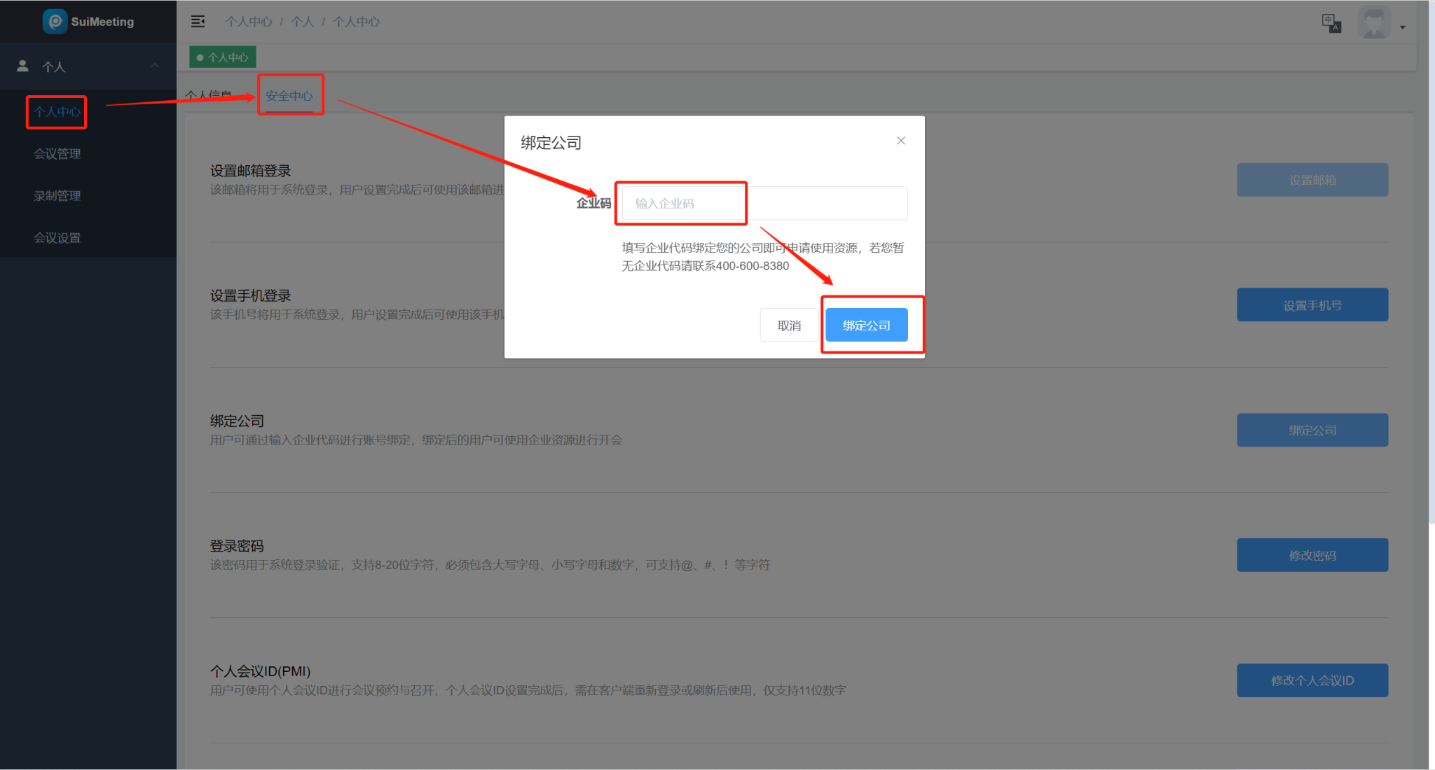 打开个人中心→安全中心→绑定企业