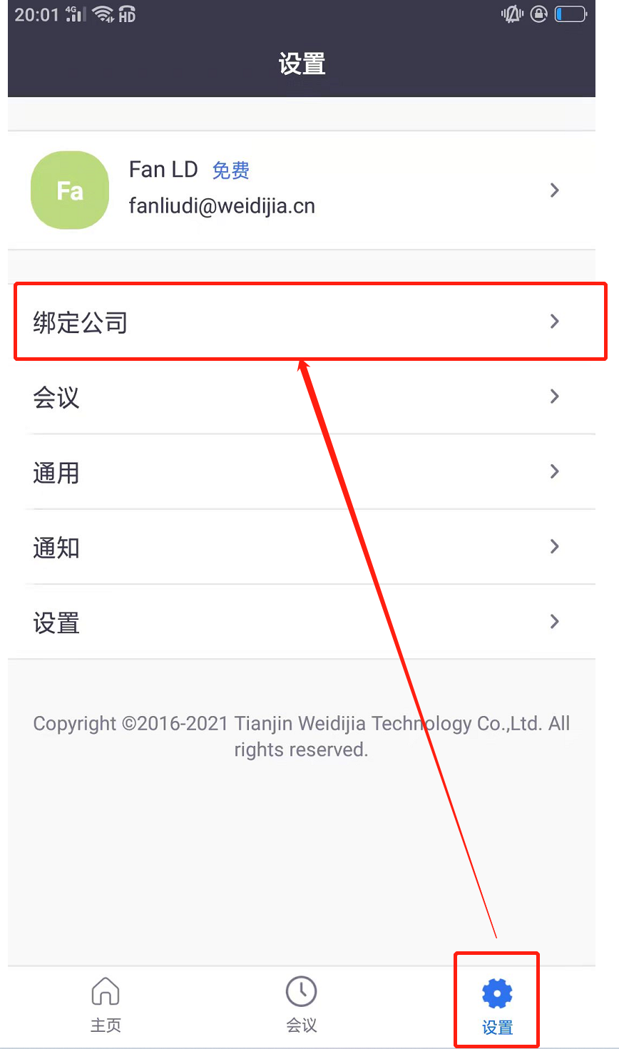 b)打开设置→绑定公司