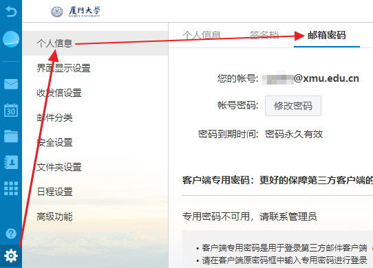 更改密码需要登录网页版邮箱,成功之后点击左下角的齿轮图标,然后再点击个人信息中的邮箱密码即可,如图所示。