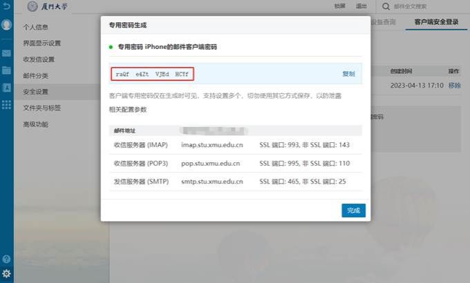 3、弹出的对话框中,上方蓝色底色中的16位字符即为这次生成的客户端专用密码,可以点击右侧的复制,粘贴到客户端的密码输入框中,请注意该密码只会出现这一次,在客户端设置好之前不要点击“完成”。