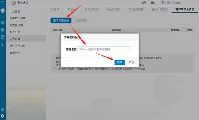 2、 点击“生成专用密码”,在弹出的对话框中填入密码名称,建议每个密码使用有辨识度的名称,方便后续管理,比如iPhone上的邮件客户端密码就叫“iPhone的邮件客户端密码”。填写完毕后点击“生成”。