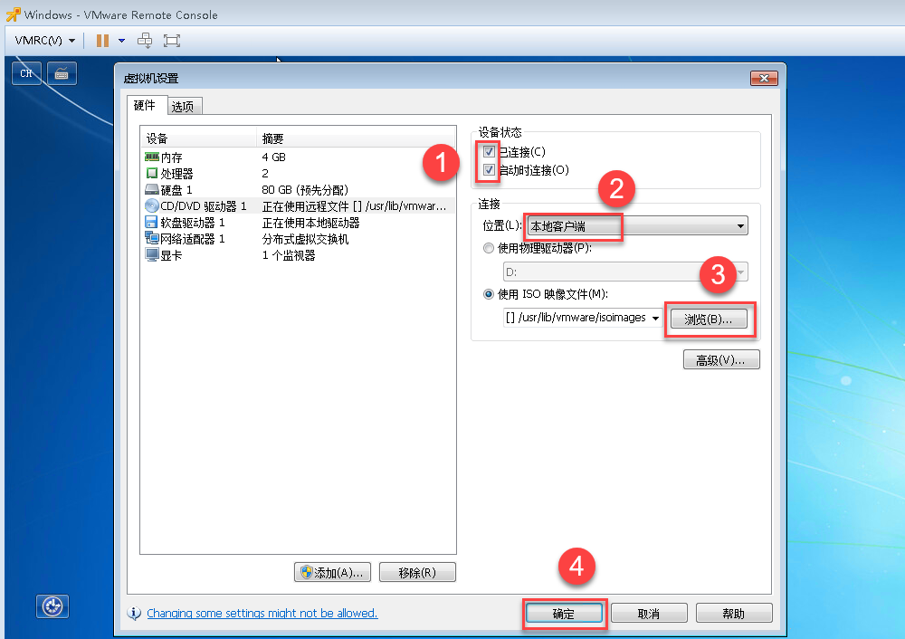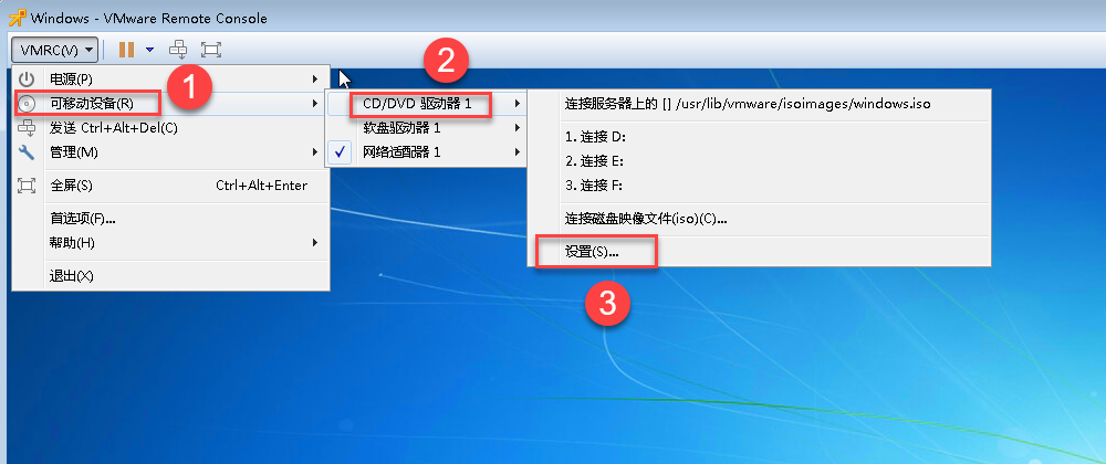 启动Remote Console控制台后,如若要挂载光驱,VMRC-->可移动设备-->CD/DVD驱动器-->设置...,如下图所示: