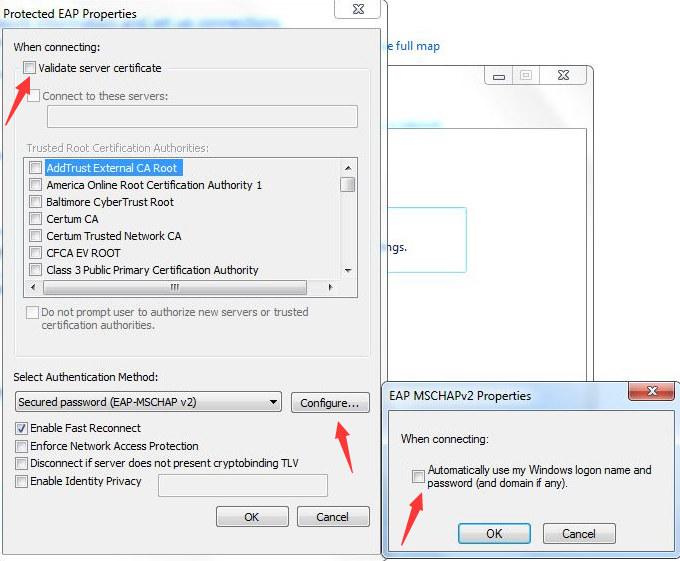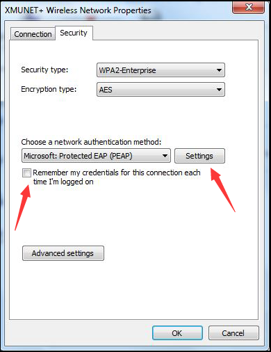 In the security properties of XMUNET +, complete the advanced settings