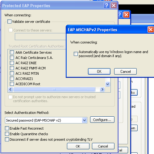 4、同时,点击进入“属性”,在弹出窗口中,不选择“验证服务器证书”,在“选择验证方法”选项中选择“安全密码(EAP-MSCHAP v2)”