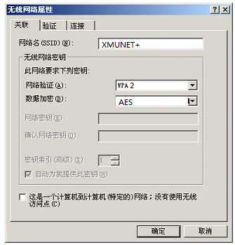 2、点击“添加”按钮,输入网络名(SSID)“XMUNET+”(注意大小写)。按下方要求设置: