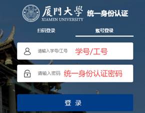 师生访问https:// wifiguest.xmu.edu.cn/,在登录界面点击“用厦大账号登录” ,将跳转至厦门大学“统一身份认证”页面,使用扫码登录或“学号/工号”及“统一身份认证密码” 〔不是校园网接入密码〕登录。