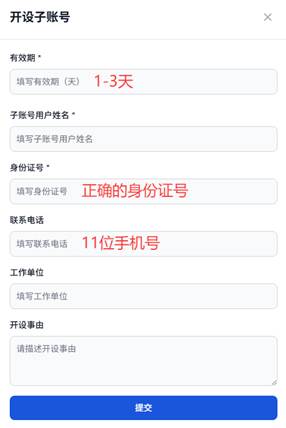 填写有效期(1至3天)、子账号用户姓名(必填项)、身份证号(必填项)、联系电话(11位手机号码)、工作单位、开设事由,确保信息真实。