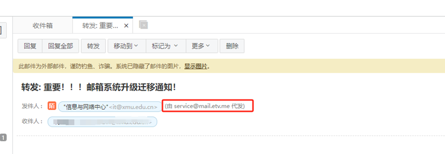 2. 邮箱的发件人不是来自校内邮箱。请注意下图的红色框框,由service@mail.etv.im代发,不是校内域名。并且邮箱提示为陌生人,需要引起高度的警惕。